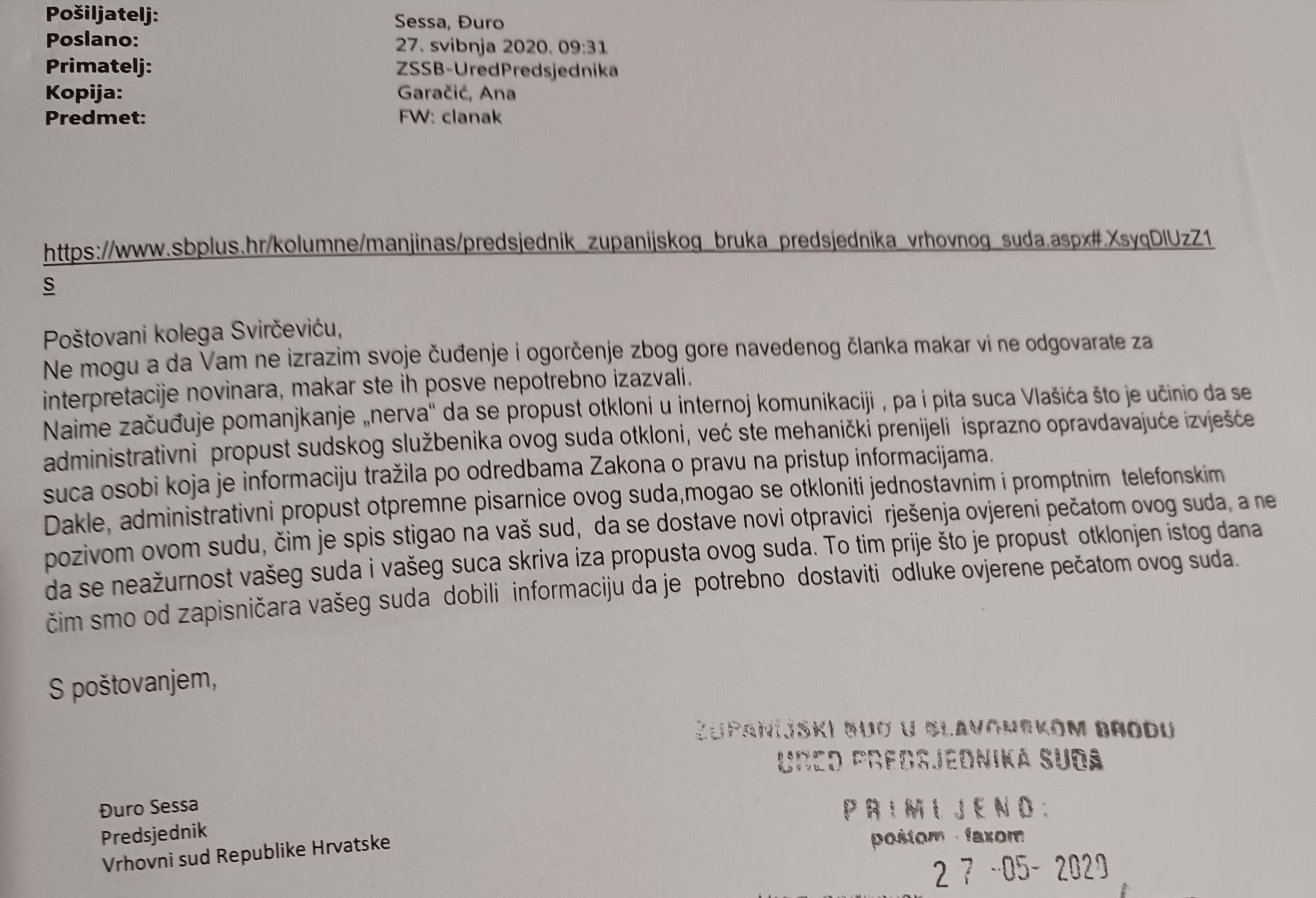 Kakav odgovor je primio Svirčević takav je proslijedio požeškoj vijećnici. Tu se uključuje SBportal, točnije, Jerko Zovak i optužuje Svirčevića da bruka predsjednika Vrhovnog suda.