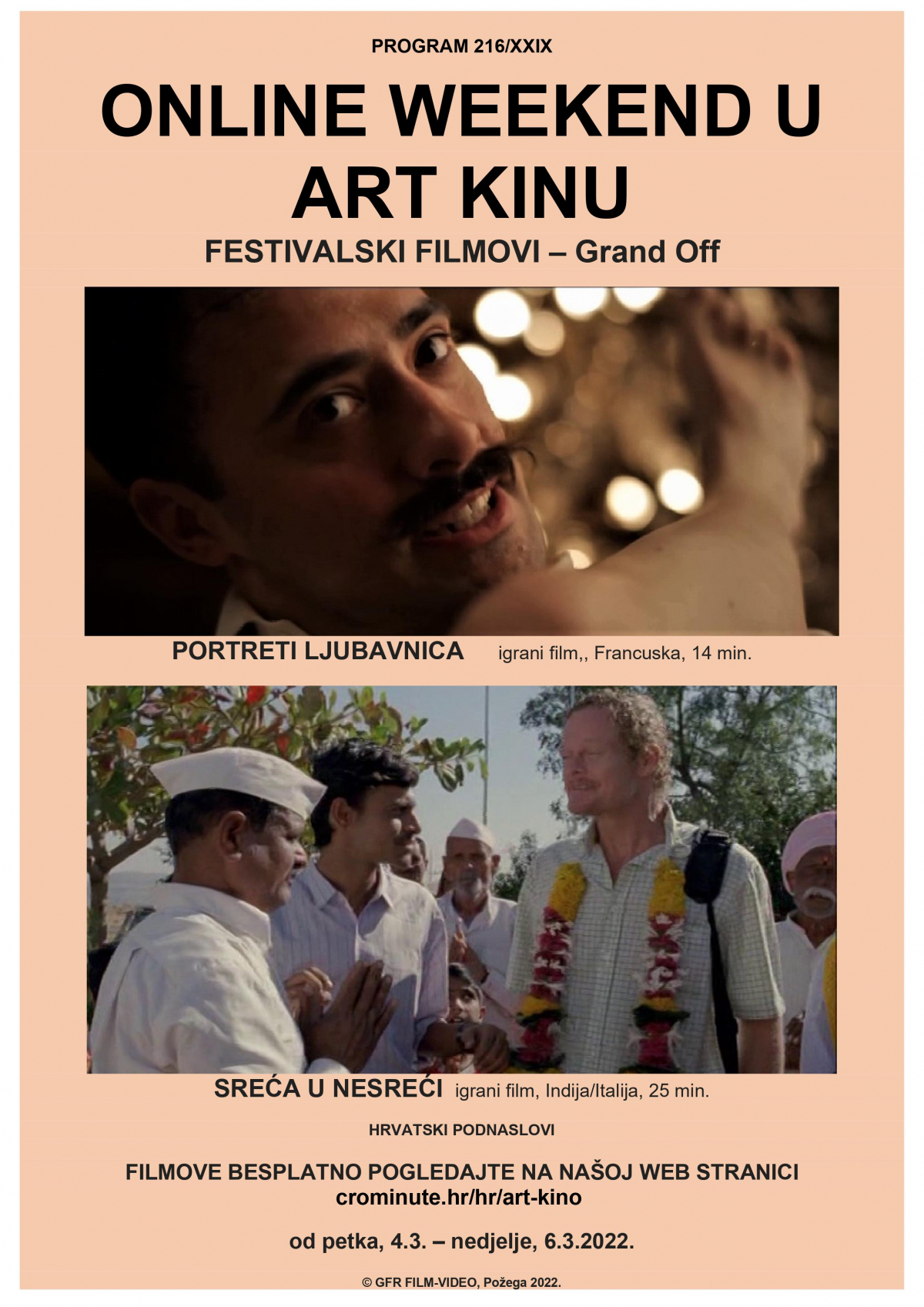 Od 4. do 6. ožujka bit će prikazana dva filma - „Portreti ljubavnica“, francuski igrani film u trajanju od 14 minuta i igrani film „Sreća u nesreći“ (Indija/Italija) u trajanju od 25 minuta. Projekcije će zbog epidemioloških ograničenja biti online, a možete ih pogledati na stranicama Art kina.
