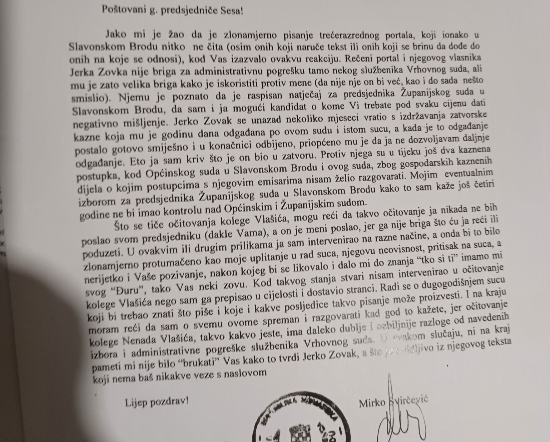 Kakav odgovor je primio Svirčević takav je proslijedio požeškoj vijećnici. Tu se uključuje SBportal, točnije, njeguv urednik osuđeni kriminalac Jerko Zovak i optužuje Svirčevića da bruka predsjednika Vrhovnog suda.