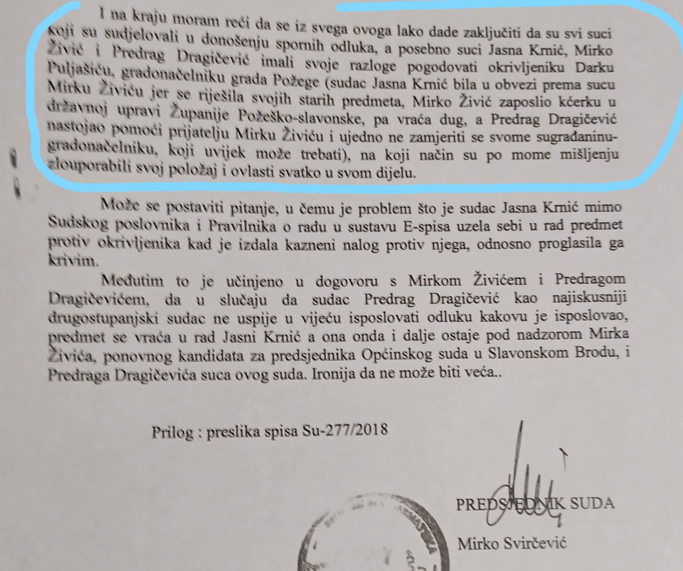 O svemu smo pisali i obavještavali Vrhovni sud, Državno sudbeno vijeće i saborski odbor za pravosuđe. Cijeli slučaj ne bi smio ostati samo na ovom uhićenju, jer Dragičević ima još takvih nedjela. Vrlo je upitna i uloga predsjednika Općinskog suda u Požegi Damira Ronka i predsjednice Županijskog suda u Požegi Dubravke Šimić.