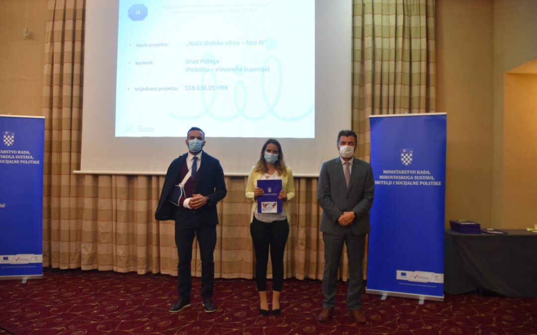 Ministarstvo je tako Gradu Požegi odobrilo financiranje projekta „Naša školska užina – faza III“, u maksimalnom iznosu prihvatljivih troškova od 518.638,00 kuna. Projektni je prijedlog pripremila Javna ustanova Lokalna razvojna agencija Požega, prijavitelj je Grad Požega, a obuhvaća četiri osnovne škole s područja grada – OŠ Antuna Kanižlića, OŠ „Dobriša Cesarić“, OŠ Julija Kempfa i Katoličku osnovnu školu u Požegi. Njime je obuhvaćeno ukupno 516 učenika kojima će se tijekom školske godine omogućiti besplatan školski obrok i na taj način ublažiti najgore oblike dječjega siromaštva