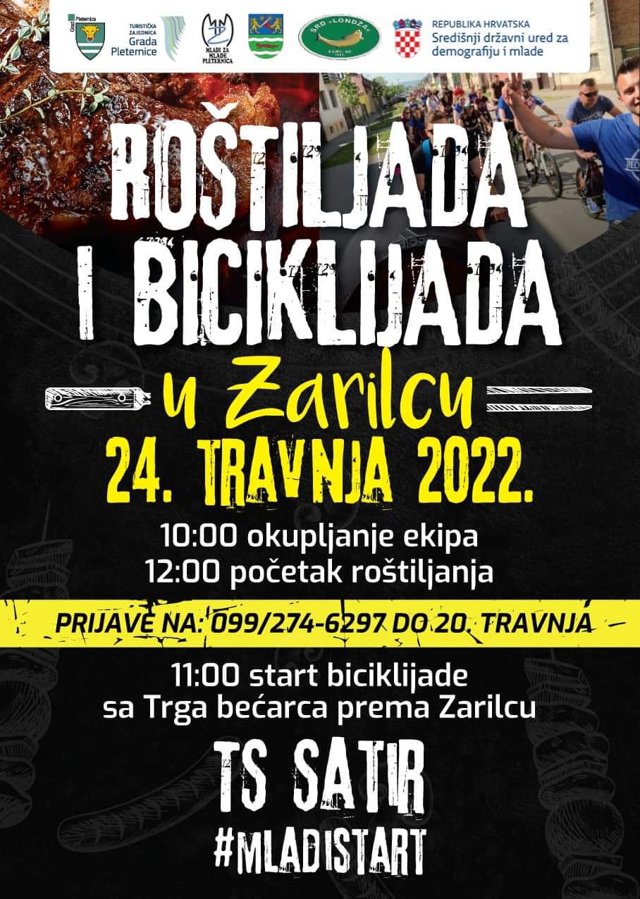 U nedjelju 24. travnja 2022. godine, održati će se  ROŠTILJADA I BICIKLIJADA u Zarilcu. Okupljanje ekipa u 10,00 sati,a početak roštiljanja u 12,00 sati.