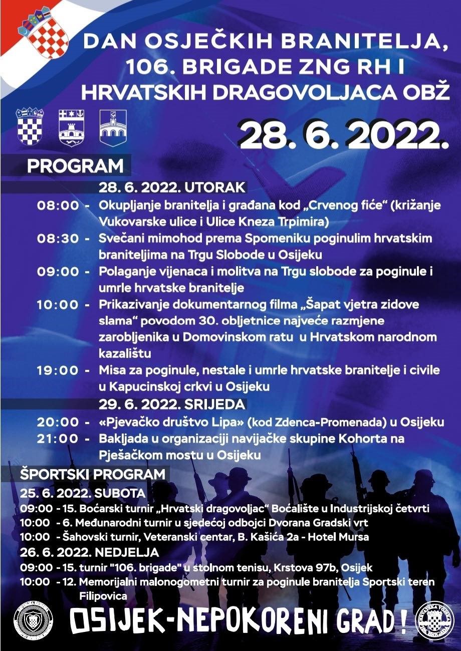 Inače, 28. lipnja u večernjim satima u Kapucinskoj crkvi održat će se misa za poginule, umrle, i nestale hrvatske branitelje, a dan kasnije, 29. lipnja, u srijedu će na Promenadi kod Zdenca nastupiti Hrvatsko pjevačko društvo Lipa od 20 sati nakon čega će članovi Kohorte upriličiti bakljadu sa 31 bakljom u spomen na 31. obljetnicu od dana kada se osnovala 106. brigada ZNG-a RH što je ujedno bio i službeni početak organizirane obrane Osijeka.