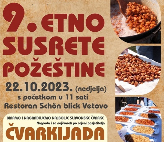 9. Etno susreti Požeštine održat će se ove godine 22. listopada na već prepoznatljivom prostoru Turističkog naselja Schon Blick u Vetovu. Kako je prošle godine, na susretima bilo preko 500 učesnika i više od 3.000 posjetitelja, za očekivati je ovogodišnje odlične susrete, uz još bolju posjećenost.