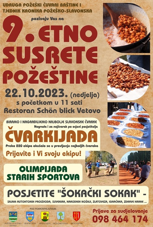 U sklopu 9. Etno susreta Požeštine koji počinju od 11 sati organizirat će se i zanimljiva natjecanja – Sportski susreti u starim sportovima sa 8 kategorija starih, već zaboravljenih sportova i poznati i veliki Šokački sokak. ”I ove godine organizirat ćemo ponovno jedan pravi Šokački sokak s šokačkim sajmom na kojemu će biti ponuda brojnih autohtonih domaćih proizvoda, domaćih suvenira i proizvoda, antikviteta i starih predmeta, zlatoveza, rukotvorina koji nastaju u rukama naših ljudi u Slavoniji i Baranji. Ove godine, jer su naši dosadašnji Etno susreti i Čvarkijada odjeknuli daleko imamo već prijavljen nastup i gostovanje udruga s područja slavonskih županija i susjednih mjesta,” dodaje organizator, najavljujući svakako dobru zabavu, te poziva sve građane da dođu, budu sudionici susreta ili samo posjetitelji, promatrači i degustatori dobrih, najboljih slavonskih čvaraka. Restoran Schon Blick za taj dan po vrlo popularnoj cijeni priprema pravi slavonski meni.