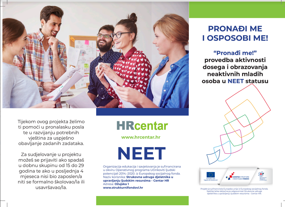 NEET vrhunski stručnjaci su tu da ti pomognu u razvijanju vještina potrebnih za pronalazak posla, razvijanje samopouzdanja te pružamo podršku pri ponovnoj integraciji na tržište rada. Za sudjelovanje u projektu možeš se prijaviti ako spadaš u dobnu skupinu od 15 do 29 godina te ako u posljednja 4 mjeseca nisi bio zaposlen/a niti se formalno školovao/la ili usavršavao/la.