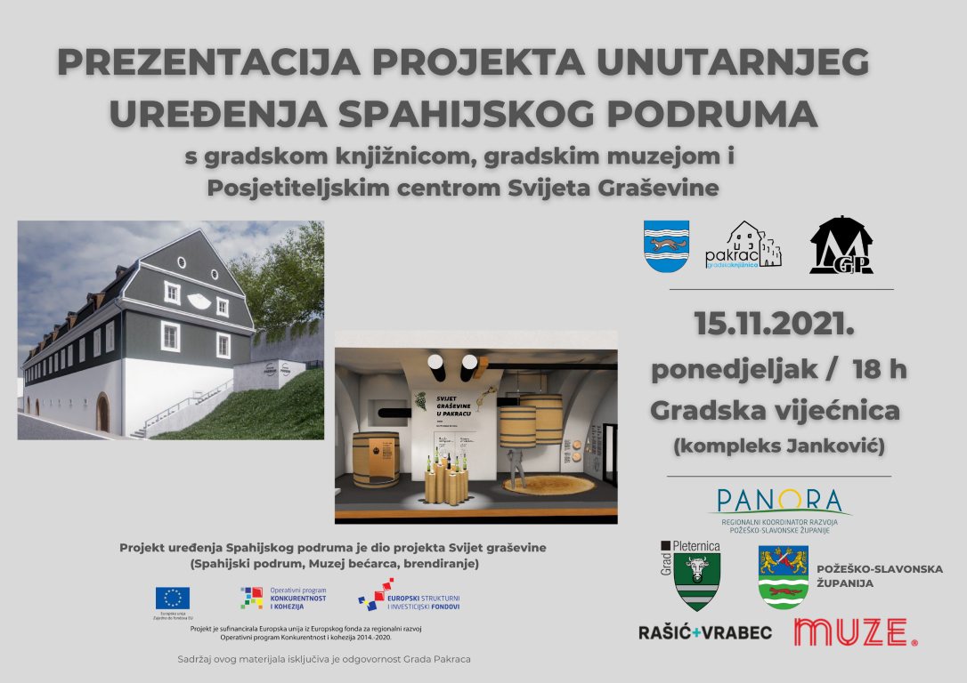 U Gradskoj vijećnici kompleksa Janković u ponedjeljak 15. studenog s početkom u 18 sati bit će održano predstavljanje projekta unutarnjeg uređenja Spahijskog podruma s gradskom knjižnicom, gradskim muzejom i Posjetiteljskim centrom Svijeta Graševine, koji je dio projekta Svijet graševine (Spahijski podrum, Muzej bećarca, brendiranje).