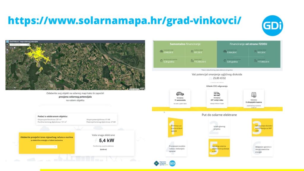 Grad Vinkovci priključio se Varaždinu i Koprivnici u projektu Mapa solarnog potencijala kojim je kroz interaktivnu web aplikaciju građanima ovih triju gradova omogućeno izračunati preporučenu snagu solarne elektrane na vlastitim objektima. Solarna mapa također prikazuje i troškove instalacije, uštede energije i emisija CO2 kroz zanimljive usporedbe te što je najvažnije, konačnu isplativost investicije. Mapa je izrađena u suradnji Grada Vinkovaca i tvrtke GDi čiji su predstavnici danas u prostorijama gradske uprave predstavili ovu interaktivnu web aplikaciju.